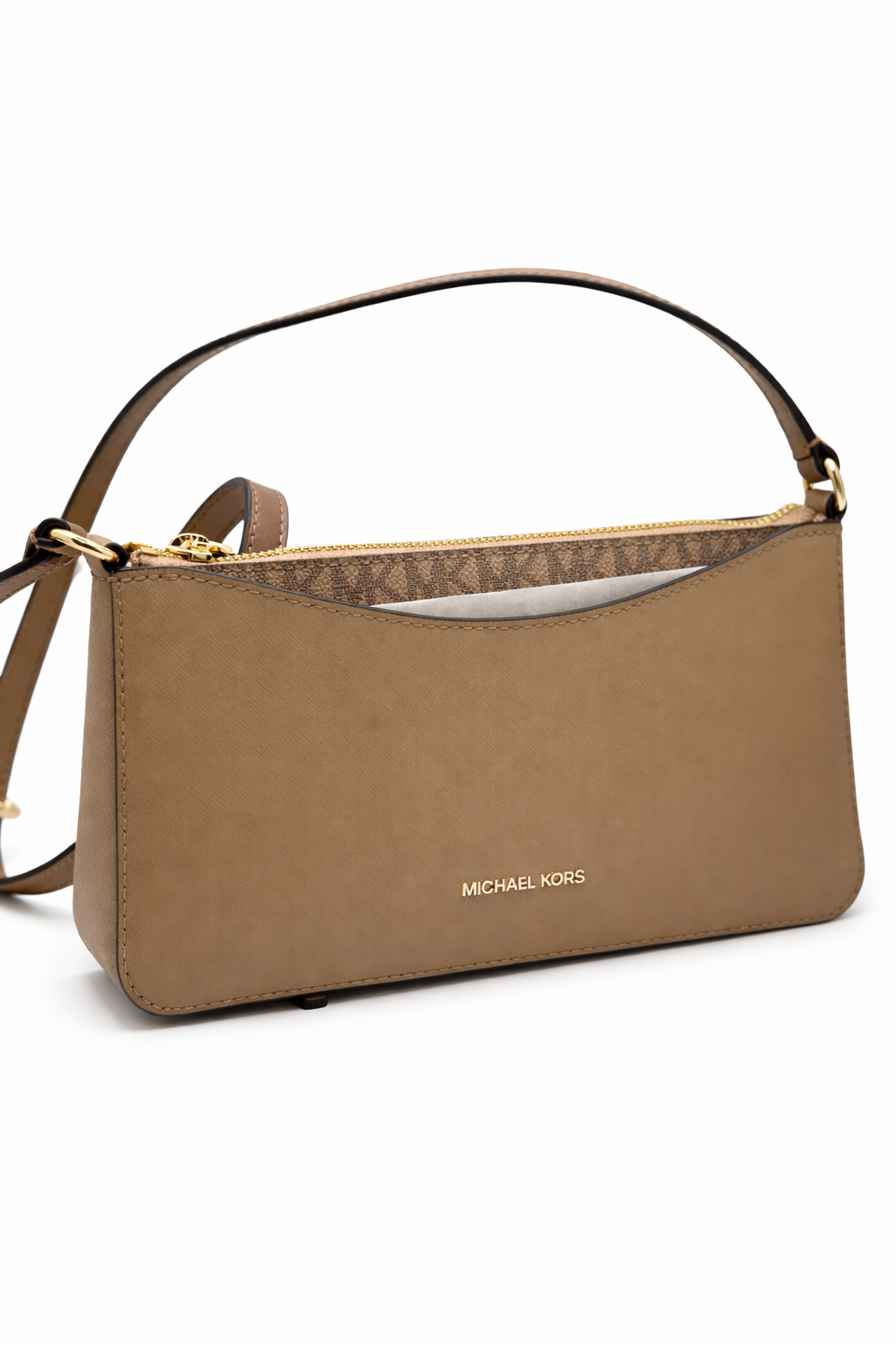 El bolso Michael Kors Jet Set East West es la combinación perfecta de minimalismo y sofisticación. Confeccionado en el resistente cuero Saffiano en un versátil tono café claro (Camel), este modelo presenta una silueta rectangular y estilizada que se adapta a cualquier ocasión. Su diseño inteligente incluye un compartimento frontal de fácil acceso con el icónico estampado de monograma, ideal para la mujer en Colombia que busca un accesorio práctico sin renunciar al lujo. Ya sea como bolso de hombro o cruzado, su estética atemporal eleva cualquier atuendo diario.