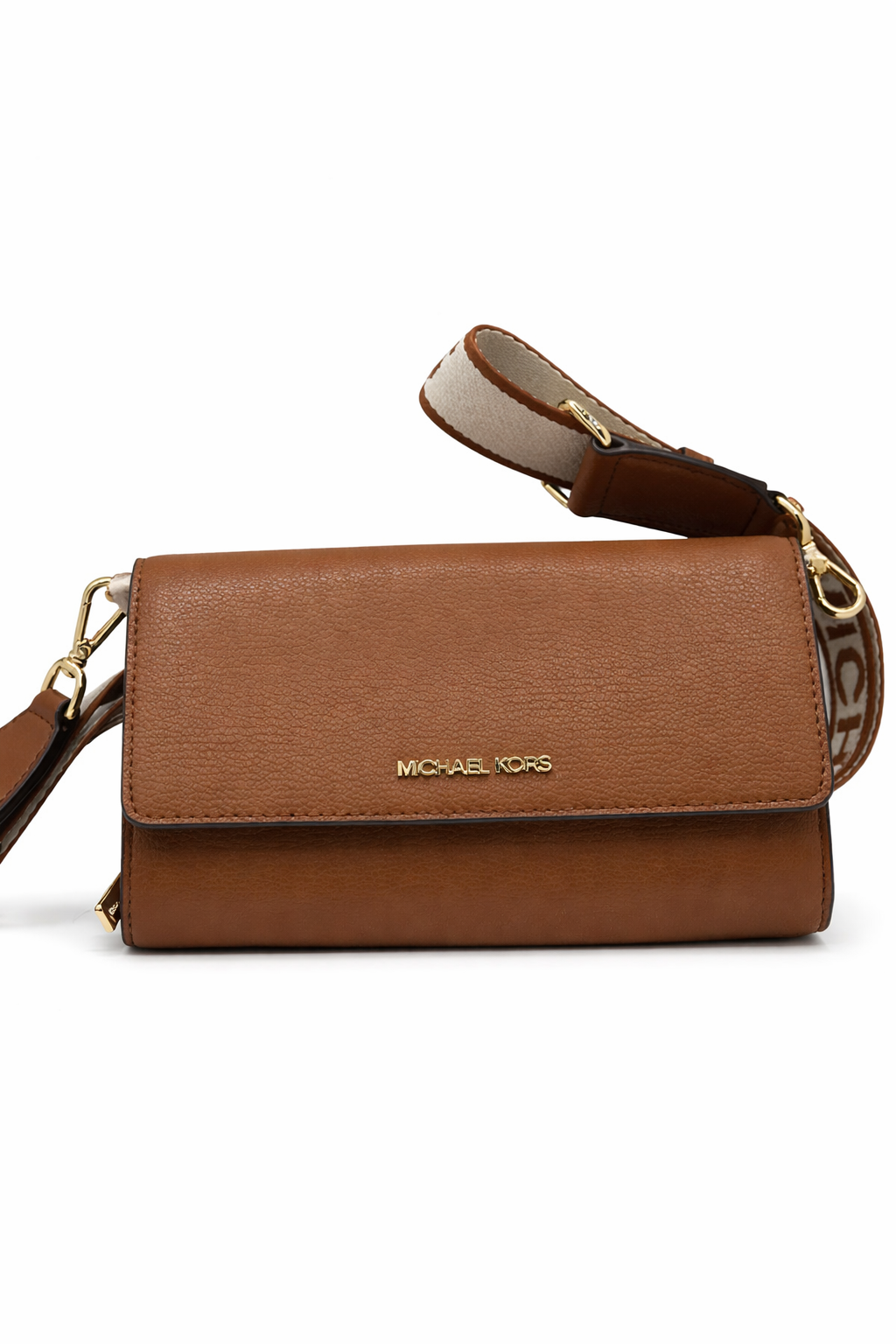 | • Logotipo de Michael Kors en relieve metálico dorado en la solapa frontal. |